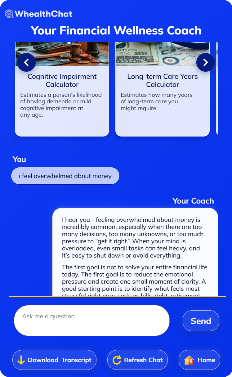 Designed like a financial therapist, the Coach can help reduce financial decision-making anxiety, alleviate retirement planning fears, lower caregiver stress levels, and improve the quality of family conversations around money and health.